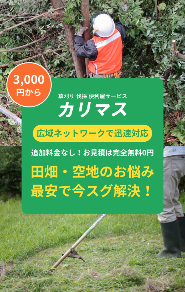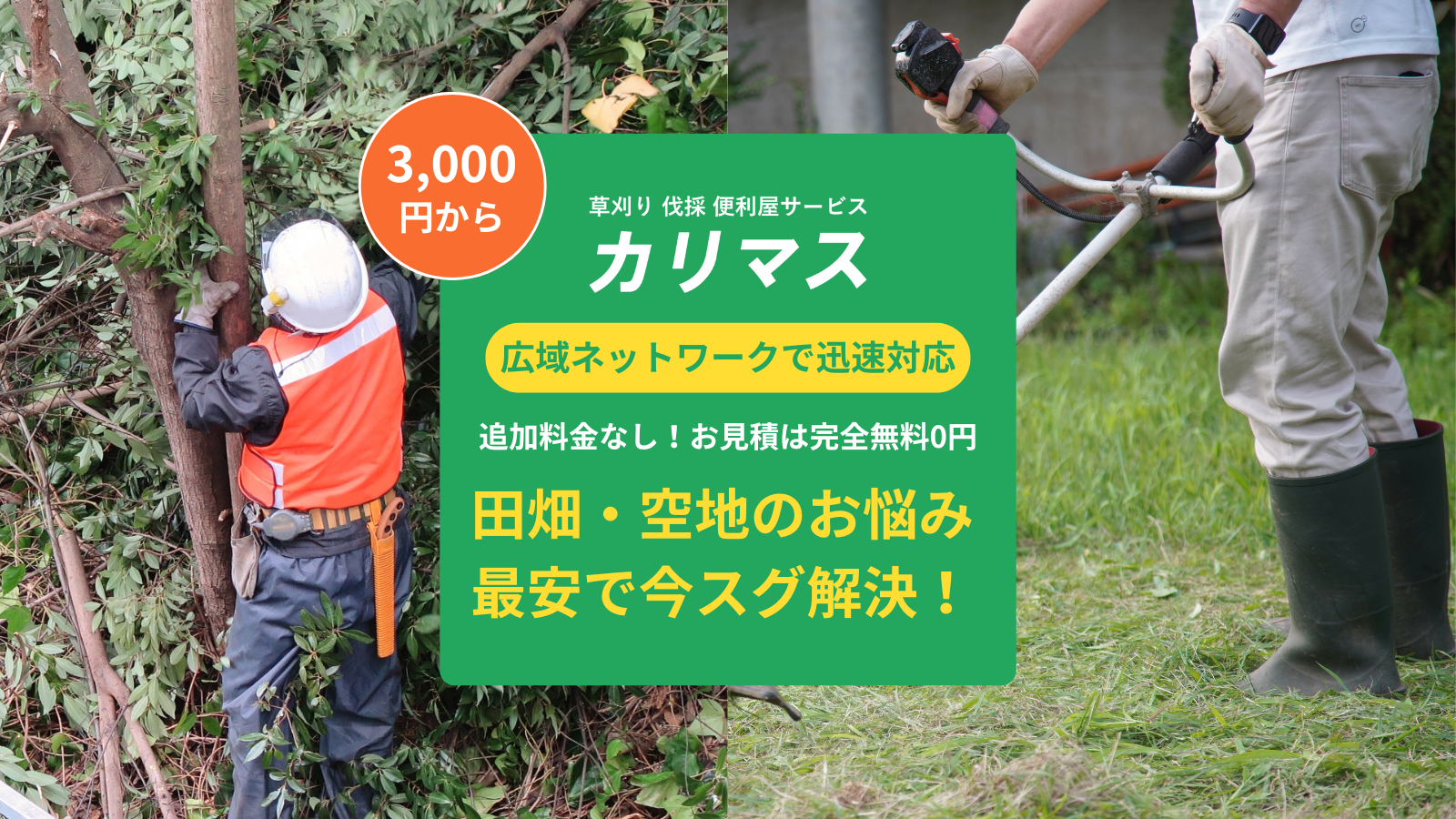 便利屋カリマスでは、田畑や空地の草刈り、枝切、伐採を税込3,000円から承ります。不用品回収や遺品整理、害虫駆除など暮らしのお困りごとにも幅広く対応。プロの技術で迅速・丁寧に解決します。ご相談とお見積もりは無料です。