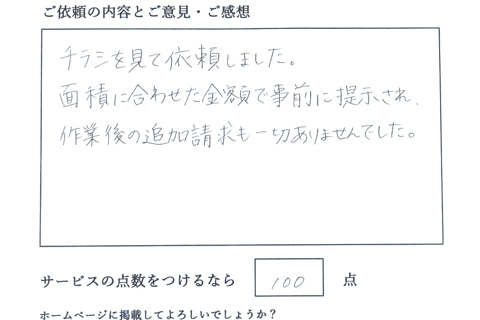 チラシを見て見積もりを依頼。面積に合わせた金額が事前に提示され、作業後の追加請求も一切ありませんでした。