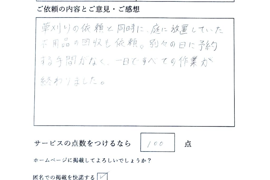 草刈りの依頼と同時に、庭に放置していた不用品の回収も依頼。別々の日に予約する手間がなく、一日ですべての作業が終わりました。