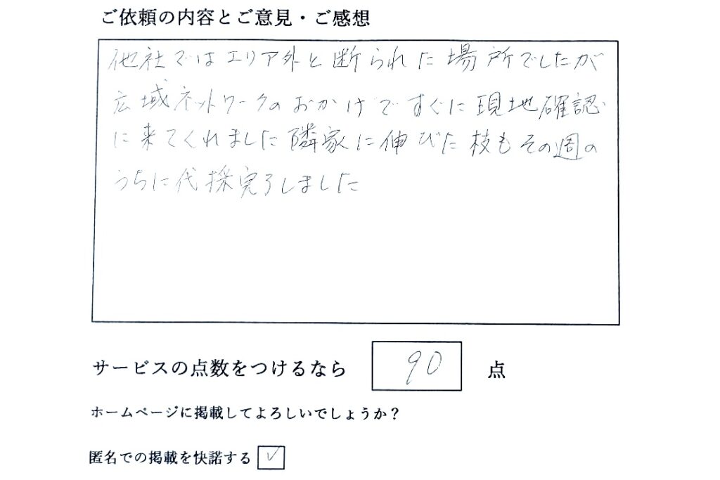 他社では対応エリア外と断られた場所でしたが、広域ネットワークのおかげですぐに現地確認に来てくれました。隣家に伸びた枝をその週のうちに伐採完了しました。。