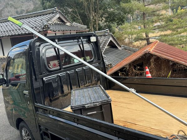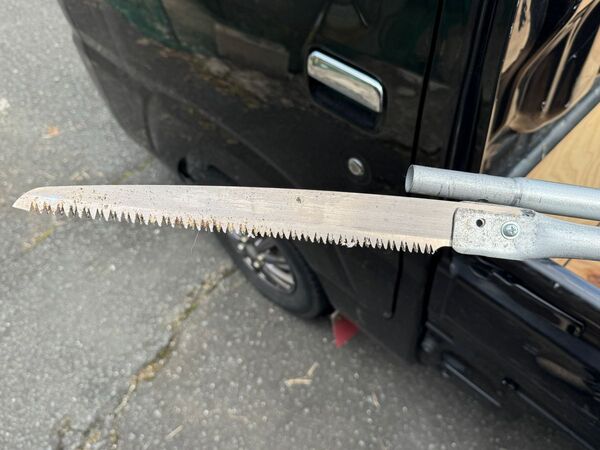 木は奥まった場所に生えており、通常のノコギリでは手が届きません。そこで今回は、長い柄を付けた自作のノコギリを用意し、離れた位置からでも安全に伐採できるよう工夫しました。