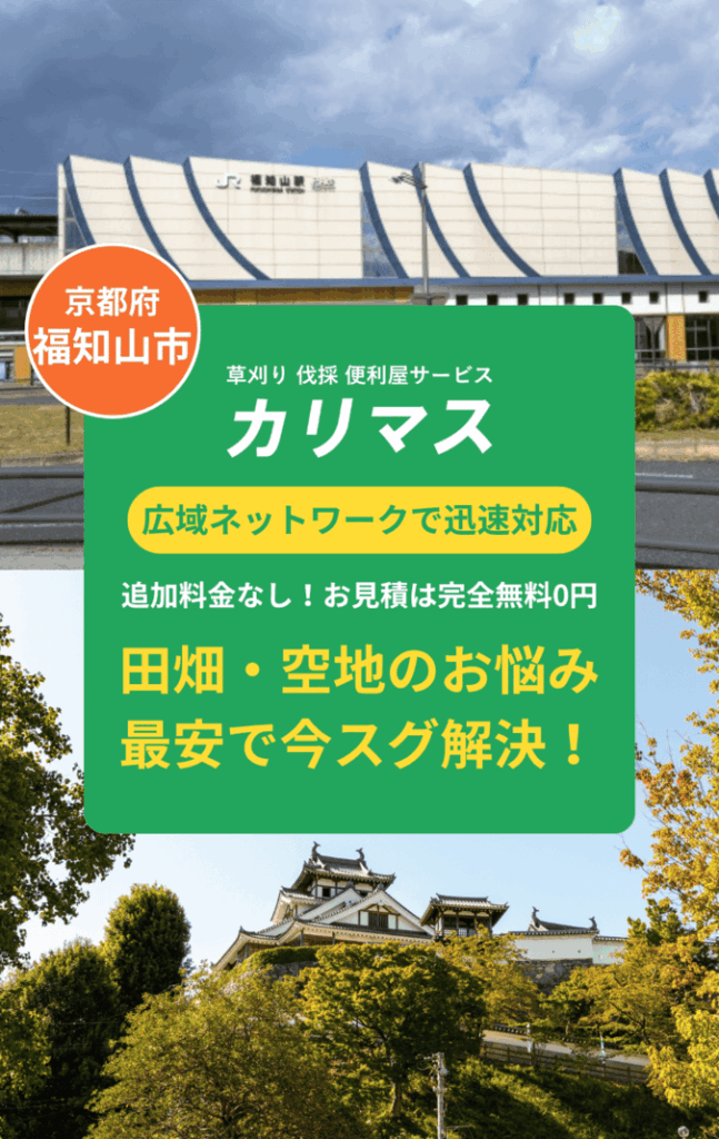福知山市を中心に、丹波市・朝来市・綾部市・京丹波町まで幅広く対応。「庭の草が伸びすぎて手に負えない」「空き家の木が電線にかかりそう」といった急を要するお悩みから、遺品整理・不用品回収まで一括で承ります。